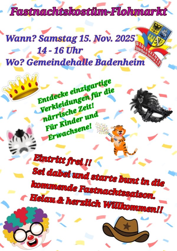 Fastnachtskostüm-Flohmarkt 14 bis 16 Uhr, Gemeindehalle